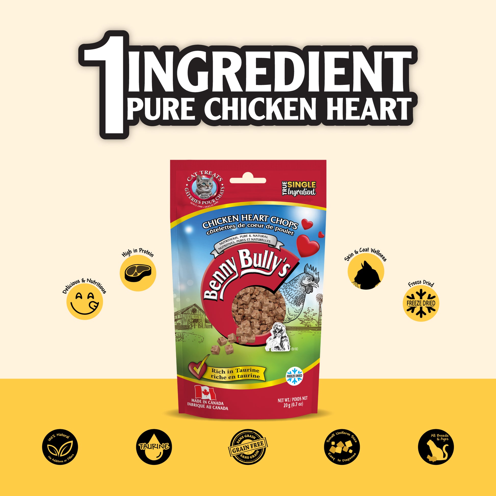 Introducing Benny Bullys® Chicken Heart Chops™ - the original single-ingredient cat treat, offering real food, real nutrition, and real satisfaction for your feline friend.