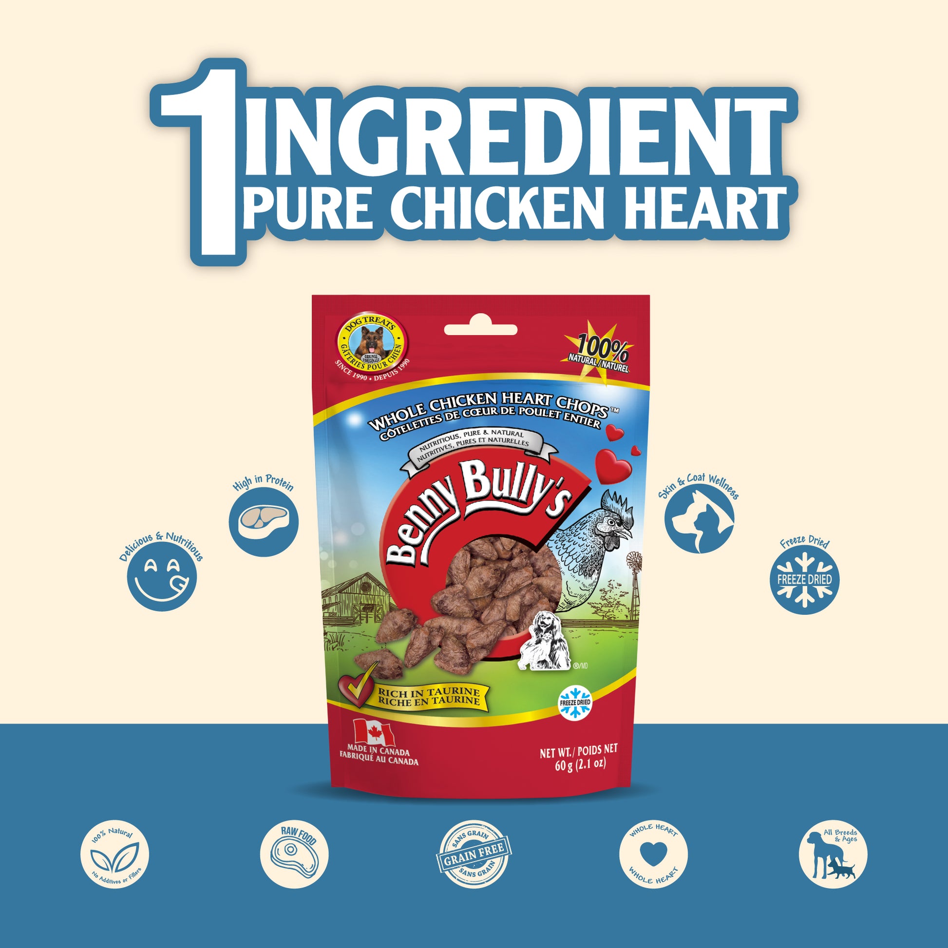 Introducing Benny Bullys® Whole Chicken Heart Chops™, the original single ingredient dog treat crafted with real food, real nutrition, and no additives, fillers, coloring, or preservatives. Dog owners seeking pure and natural alternatives have found their solution in Benny Bullys®. Our innovative cutting and drying process ensures that no chemicals are added, making Benny Bullys® a standout in the market.