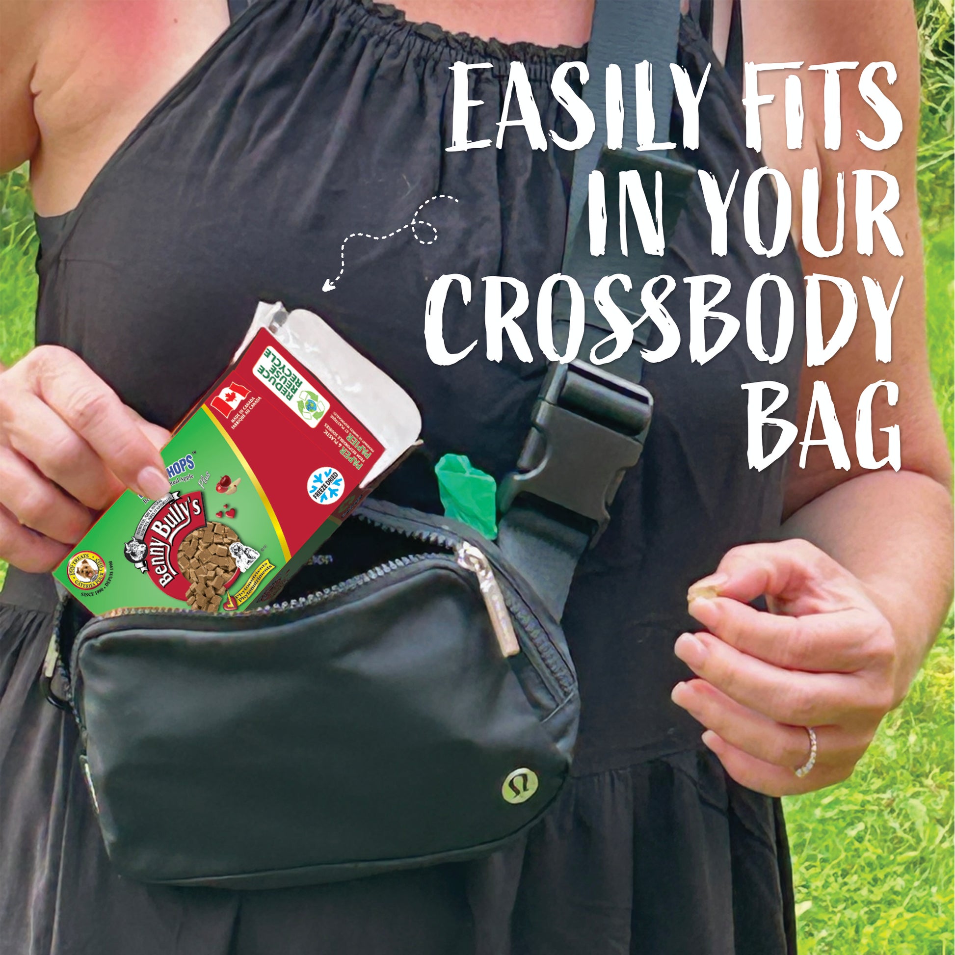 These treats are packed with vitamins A and C, fiber, and phytonutrients, thanks to real apples that help fight off illness and disease while providing energy to keep them going throughout the day. The box fits easily in a crossbody bag as well as your pocket, making it a great choice for training and dog walking!