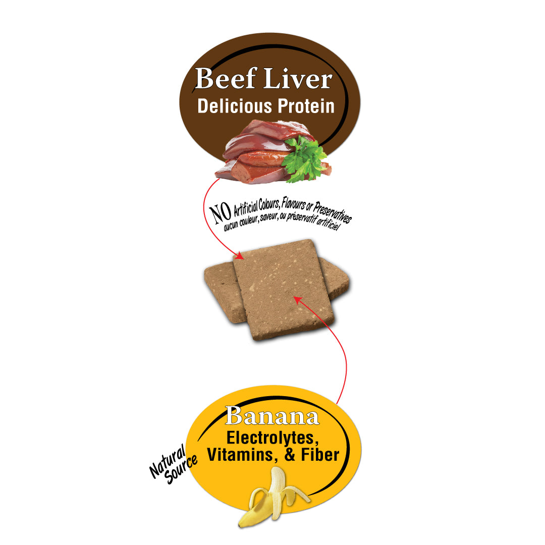 Fuel your dog with the power of bananas with Benny Bullys® Beef Liver Plus Banana Treats! Bananas are a rich source of electrolytes, vitamins and minerals to keep them hydrated and energized during their activities. Not only are they delicious for your furry friend, but bananas also provide important amino acids, vitamins B6 and C, potassium, fiber and manganese. Plus, they contain iron, folic acid, vitamin A, and B12, making them a complete and balanced source of nutrition.
