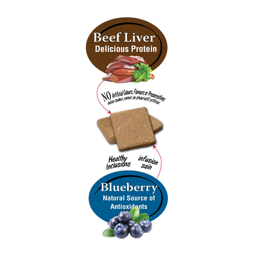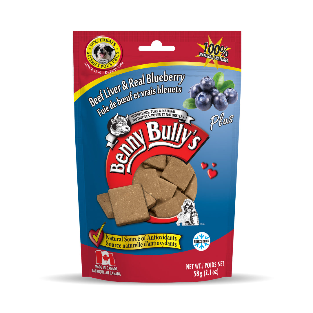 A nutritious and delicious snack for your furry friend - Benny Bullys® Beef Liver Plus Blueberry! Blueberries are an excellent source of antioxidants that may help protect your dog from illnesses, may also promoting cognitive function and heart health. They're also a great source of vitamin C, vitamin K and dietary fiber, providing your canine with energy and vitality. In combination with our tasty beef liver, these treats are low in fat while being high in iron, folic acid, and vitamins A & B12. Plus, their natural flavors will surely enhance the taste buds of any dog out there!