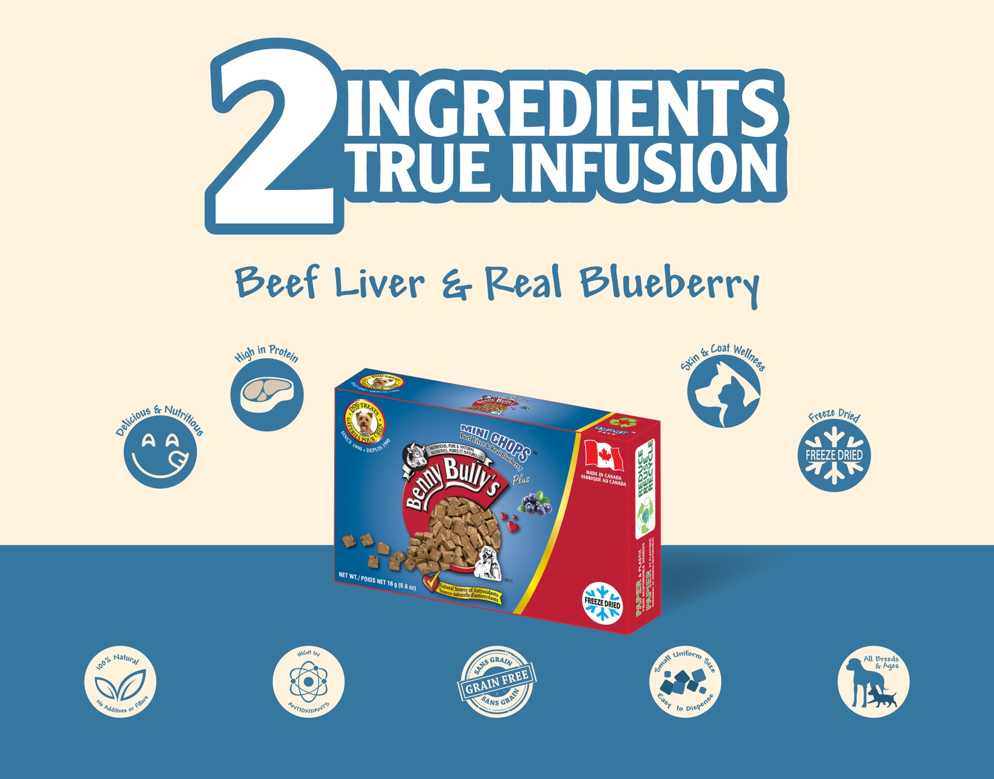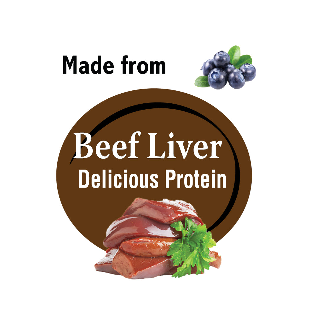 Treat your dog to Benny Bullys® Mini Chops™ - Beef Liver & Blueberry in Smart Pack™: a nutritious and delicious snack that packs a punch! Blueberries provide antioxidants that protect your dog from illnesses and promote cognitive function and heart health. In addition, they're loaded with vitamins C, K, and fiber for an extra energy boost. Paired with our flavor-packed beef liver, these treats are low in fat and contain iron, folic acid, and vitamins A & B12 for a well-rounded diet. Plus, the natural flavors will please even the pickiest taste buds out there!