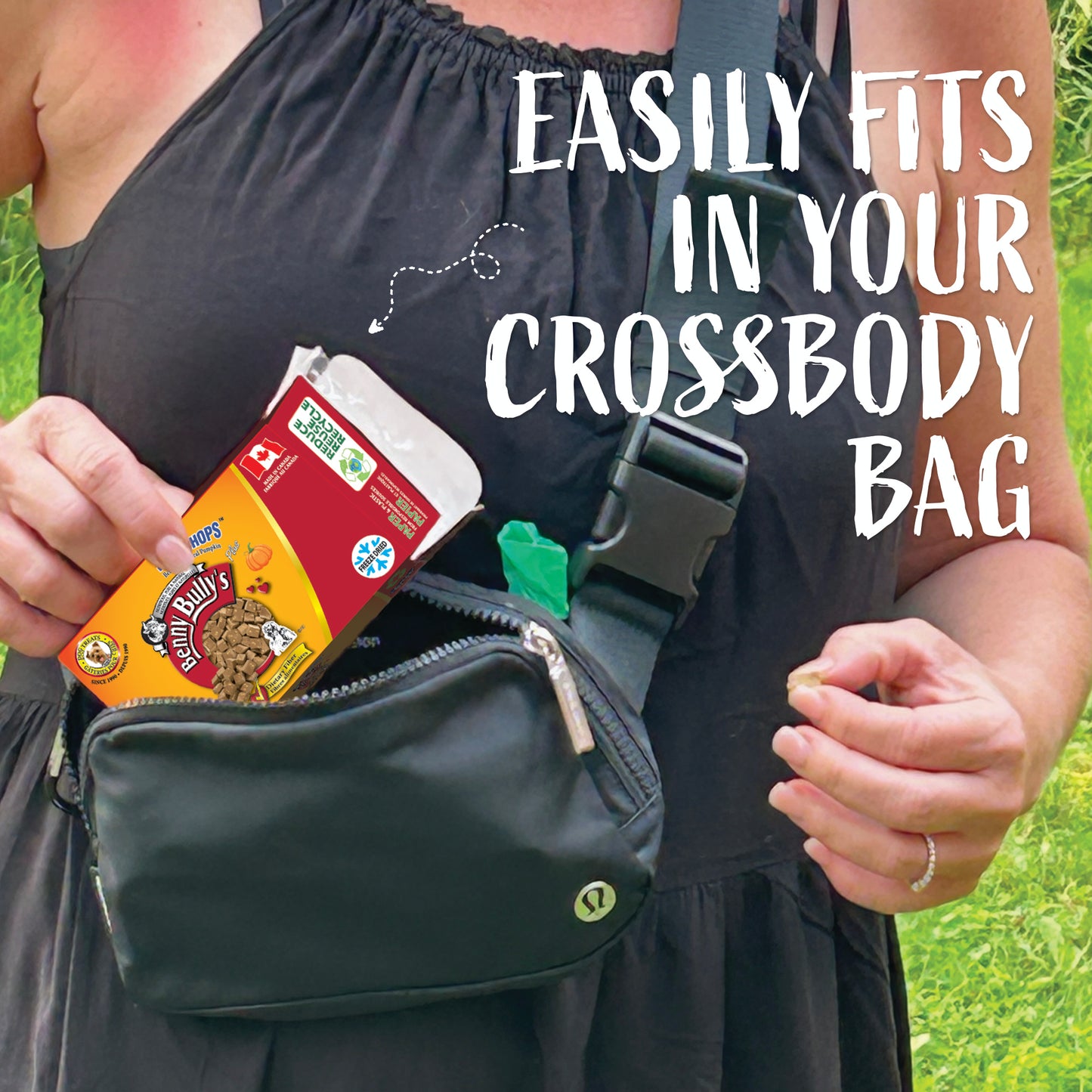 Our yummy mini chops fit easily into a crossbody bag as well as your pocket and are great for training your pet. Made with human grade ingredients, our treats are nutritious, pure and natural. They are also low in calories and come in 100% recyclable packaging - our way of giving back to the environment.