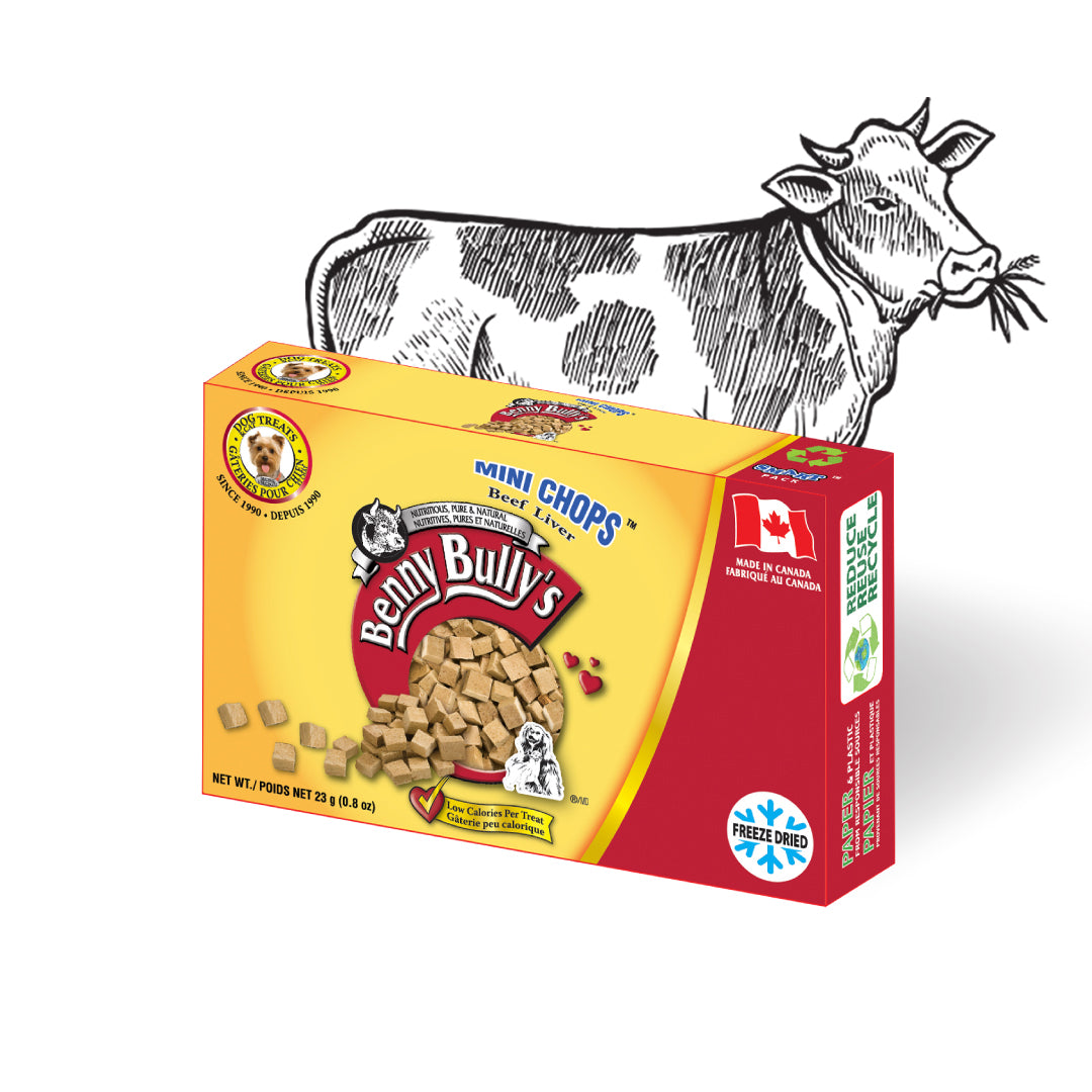 Give your pet the irresistible flavor of Benny Bullys® Mini Chops™ - Beef Liver in Smart Pack™. Made with only 1 ingredient - high-quality beef liver that's delicious and packed with protein. With low calories per treat, our mini chops are the perfect snack for training your furry friend with a low fat reward.