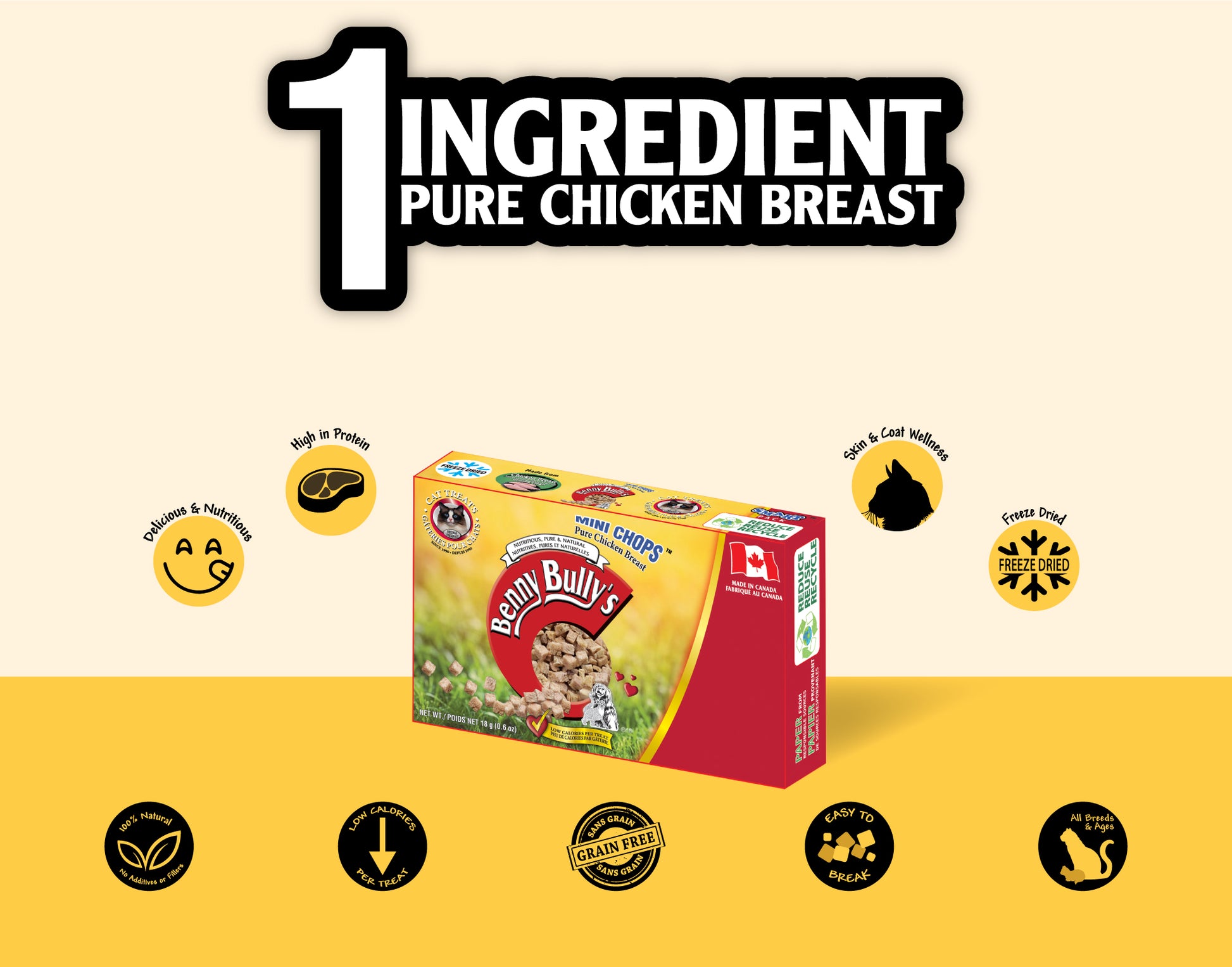 Introducing Benny Bullys® Mini Chops™ Pure Chicken Breast cat treats in Smart Pack™ - great source of high-quality protein and important nutrients like selenium, phosphorus, and vitamin B6, which are crucial for preserving your cat's overall health. They are made from 100% pure chicken breast.