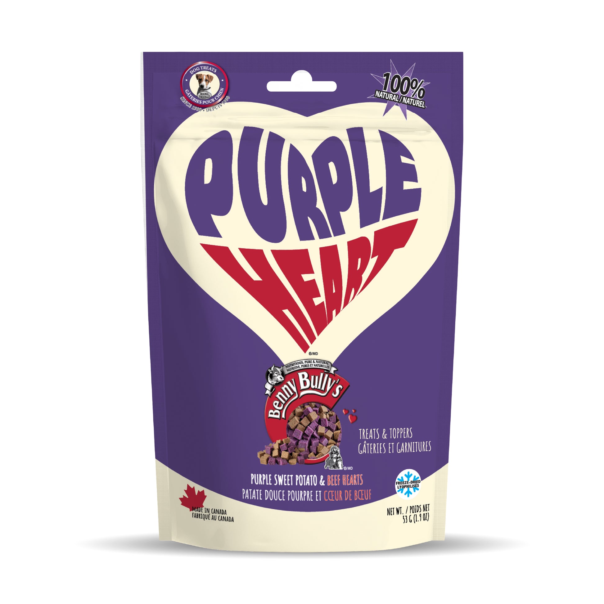 We developed an innovative cutting and drying process, as an alternative to conventional food preservatives, making Benny Bullys® one of the few "no chemicals added" treats on the market today. Purple sweet potatoes are hand selected and combined with Benny Bullys beef heart chops, making a perfect treat for dogs of all breeds and ages, and their health conscious owners.
